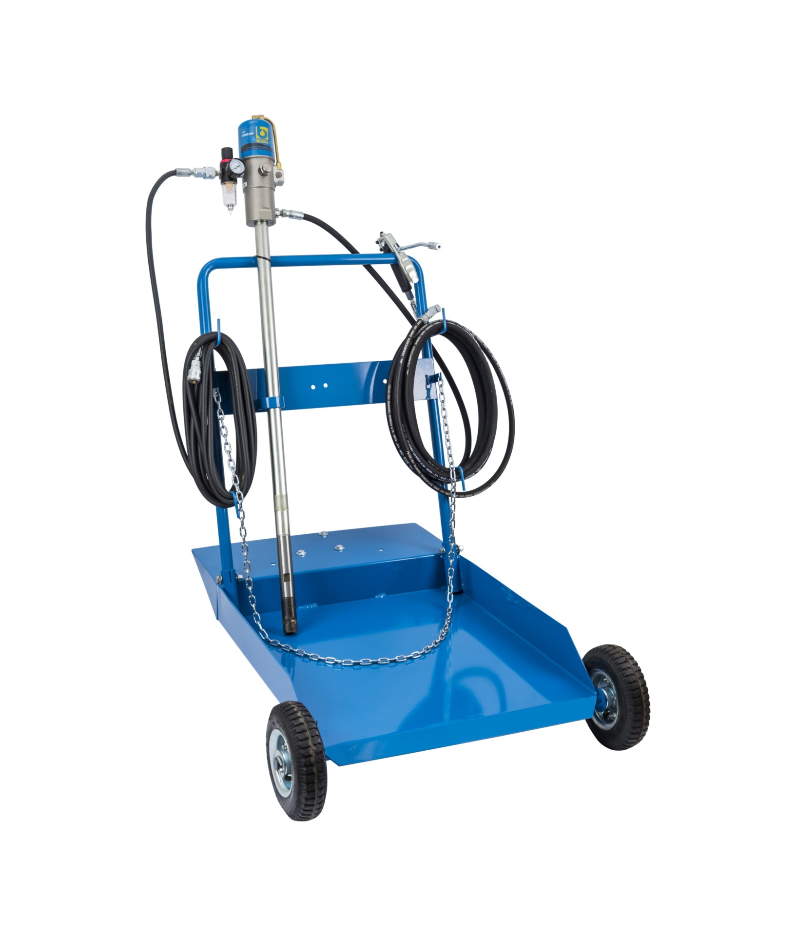 Equipamento móvel para lubrificação e transporte de tambores de graxa de 200kg, acionado por bomba pneumática, ideal para ônibus, transportadoras, concessionárias e indústrias em geral.