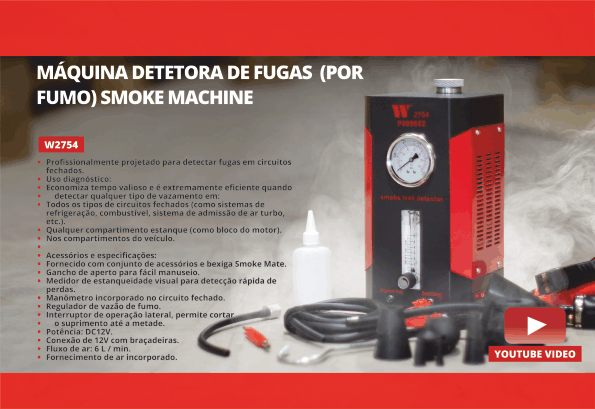 Acessórios e especificações: • Fornecido com conjunto de acessórios e bexiga Smoke Mate. • Gancho de aperto para fácil manuseio. • Medidor de estanqueidade visual para detecção rápida de perdas. • Manômetro incorporado no circuito fechado. • Regulador de vazão de fumo. • Interruptor de operação lateral, permite cortar • o suprimento até a metade. • Potência: DC12V. • Conexão de 12V com braçadeiras. • Fluxo de ar: 6 L / min. • Fornecimento de ar incorporado.