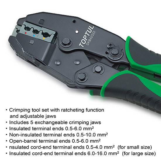 Home FERRAMENTAS ESPECÍFICAS AUTO / MOTOR / CARROÇARIA KIT ALICATE DE CRAVAR TERMINAIS ISOLADOS E NÃO ISOLADOS 6PÇS KIT ALICATE DE CRAVAR TERMINAIS ISOLADOS E NÃO ISOLADOS 6PÇS SKU: GAAI0605 121,22 € 141,45 € Desconto de %. IVA incluído. Comprar Contactar Adicionar à wishlist CARACTERÍSTICAS: O mecanismo de roquete de cravagem fornece uma poupança de trabalho superior. Alteração de mandíbula de inserção rápida sem qualquer ferramenta. Mandíbulas de cravagem de liga de aço AISI profissional. Punho confortável ergonómico. CONTEUDO: 1 DKBA2222 > Roquete de cravagem intermutável rápido1 DLAA0601 > Terminal isolado DIN 0.5-1.0/1.5-2.5/4-6 mm21 DLAA1001 > Terminal não isolado DIN 1.5/2.5/6/10 mm21 DLAA0602 > Terminal aberto DIN 0.5-1.0/1.5-2.5/4-6 mm21 DLAA0401 > Terminal isolado de cabo (para tamanho pequeno)DIN 0.5/0.75/1.0/1.5/2.5/4.0 mm21 DLAA1601 > Terminal isolado de cabo (para tamanho grande)DIN 6/10/16 mm2 PRAZOS ENTREGA: * Stock Disponível (envio imediato) / "Quantidades superiores ao disponível contactar por email." * No armazém central (entrega em 2-3 dias uteis) * No armazém europeu (entrega em 3-6 dias uteis) * Pedido mediante solicitação ou disponibilidade limitada, o prazo de entrega será confirmado após o pedido. Marca TOPTUL - Ferramentas Profissionais Características Partilhar